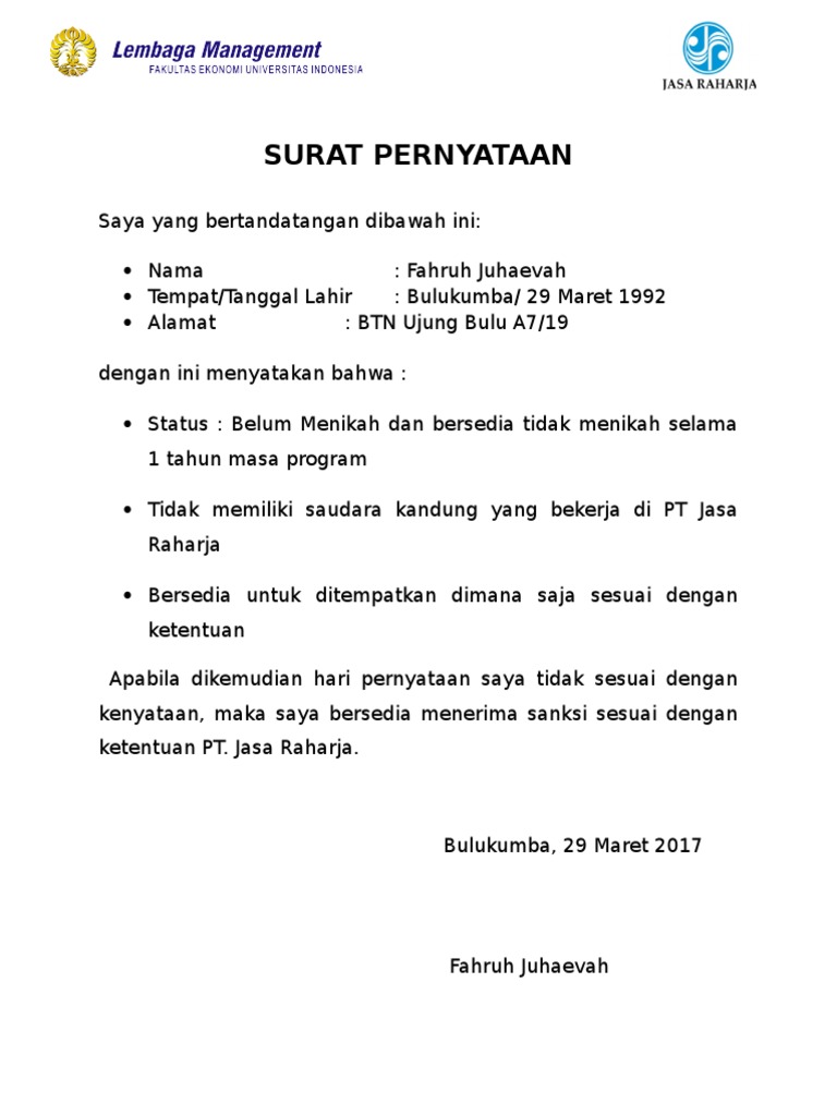 Surat pernyataan dibutuhkan dalam melamar. Dalam bentuknya jika disebutkan dengan lisan, pernyataan sulit untuk. Saya yang bertanda tangan di bawah ini. Dengan ini menyatakan bahwa sampai saat ini saya belum menikah dan bersedia untuk tidak menikah selama 1 tahun terhitung mulai tanggal saya diterima bekerja. Contohnya ketika melamar pekerjaan, kita akan mudah dipercaya terkait status mapun komitmen kita. Contoh ѕurаt pernyataan kerja untuk tidak menyalahgunakan demikian pernyataan ini saya buat dengan sesungguhnya dan penuh kesadaran, saya bersedia dituntut dimuka pengadilan. Jika kamu diharuskan membuat surat pernyataan bersedia tidak menikah, maka kami akan memberikan berikut ini ada 2 contoh surat penyataan tertulis yang menerangkan belum menikah dan tidak surat pernyataan tidak menikah. Dalam surat penyataan resmi, sebelum ditandatangani, surat pernyataan diberi materai terlebih dahulu kemudian baru ditandatangani. Pernyataan yang akan diberikan secara lisan sering kali sulit untuk diingat dengan secara terperinci. Apabila saya tidak memenuhi pernyataan ini, saya bersedia diberhentikan dengan tidak hormat sebagai calon pegawai negeri sipil/ pegawai negeri sipil. Tidak perlu khawatir, kini telah tersedia berbagai contoh surat pernyataanuntuk berbagai keperluan sehingga memudahkan anda untuk membuat surat pernyataan sesuai kebutuhan, misalnya surat pernyataan belum menikah atau surat pernyataan bebas. Semoga format doc (word) yang dilampirkan di atas dapat membantu kamu semua. Syarat pendaftarannya adalah melengkapi semua berkas yang diperlukan.